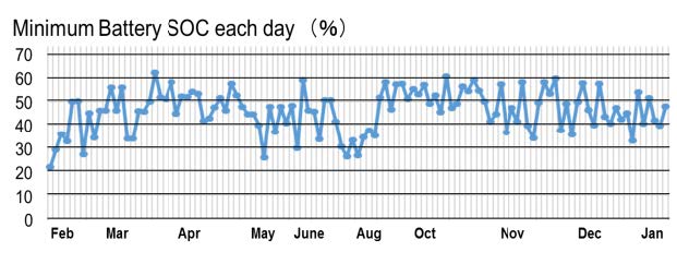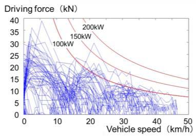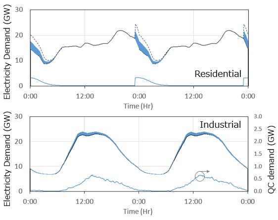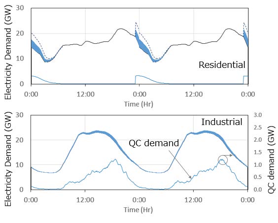 このシミュレータを用いて様々な環境での電力負荷の挙動を検討している.2040年頃のEV化率35%時の,図6-36に示す東京電力管内の電力負荷の模擬結果は,帰宅後の普通充電の絶対量は小さいものの,ピークが家庭部門のピークと重なってしまい,住宅街の電力系統に影響を及ぼすことが予想される.負荷を夜間にシフトさせるための電力価格を設定した場合はピークのシフトができる反面,夜間の初期に新たなピークが発生することが推測されるが,日あたりの走行距離の短いユーザが一定のSOCを目処に充電する様に行動した場合ピークを2.2GW削減出来ると推測している.
