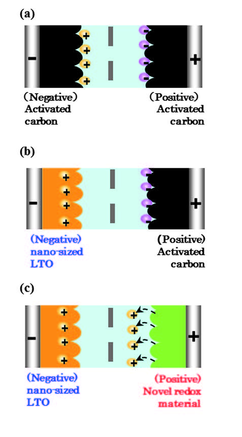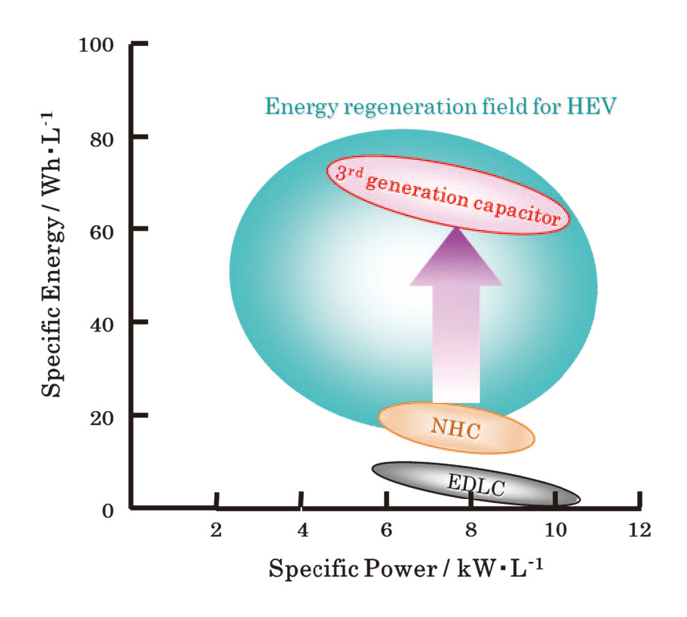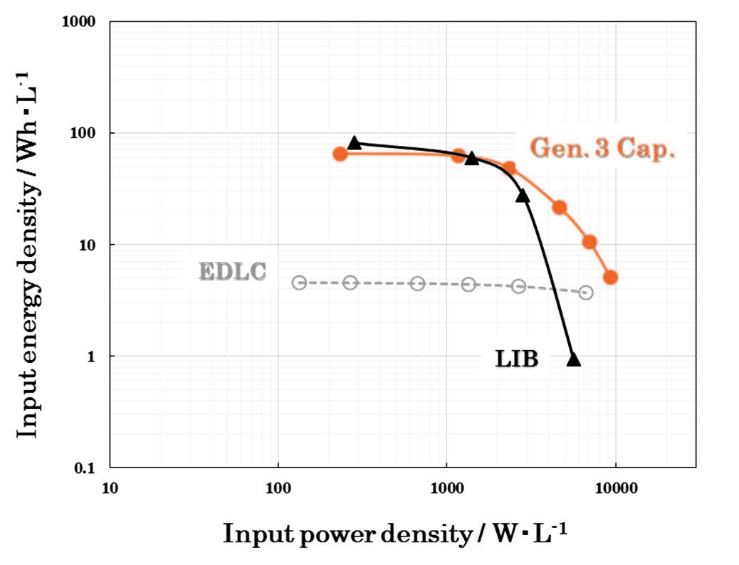 EDLC(電気二重層式キャパシタ)は,高電流レートでの回生エネルギーの吸収が可能であり,物理現象によることから電池に比べて安定であるが,動作電圧が低いことと静電容量に関係する活性炭の表面積も理論上限界に来ていることから大幅なエネルギー密度の改善が期待できないのが現状である.湊ら(6-2)は,この様な現状を打破してエネルギー密度の向上を図って開発した二つの蓄電デバイスについて紹介した. Liイオンキャパシタ(LIC)のLiB電極としては安全性の高いチタン酸リチウム(LTO)が注目されているが電気伝導性が低いことやLiイオン拡散速度が遅いことから高電流レートでの特性に難があることが知られている.そこで5~20nm程度のナノ結晶LTO(nc-LTO)を開発し,ナノ結晶化によって前述の高レートでの特性の改善を図った.一つは負極にnc-LTOを用いたLICで図6-12の(b)に相当するもので,ナノハイブリッドキャパシタ(NHC)と呼ぶ.もう一つはこの正極に新規開発の高出力レドックス材料を用いた同図(c)のもので,第3世代キャパシタ(Gen. 3 Cap)と呼ぶ.これらの関係は図6-13に示す様に,出力密度を落とさずにエネルギー密度をそれぞれ3倍,15倍に向上したものとなる.