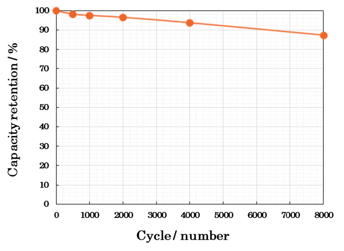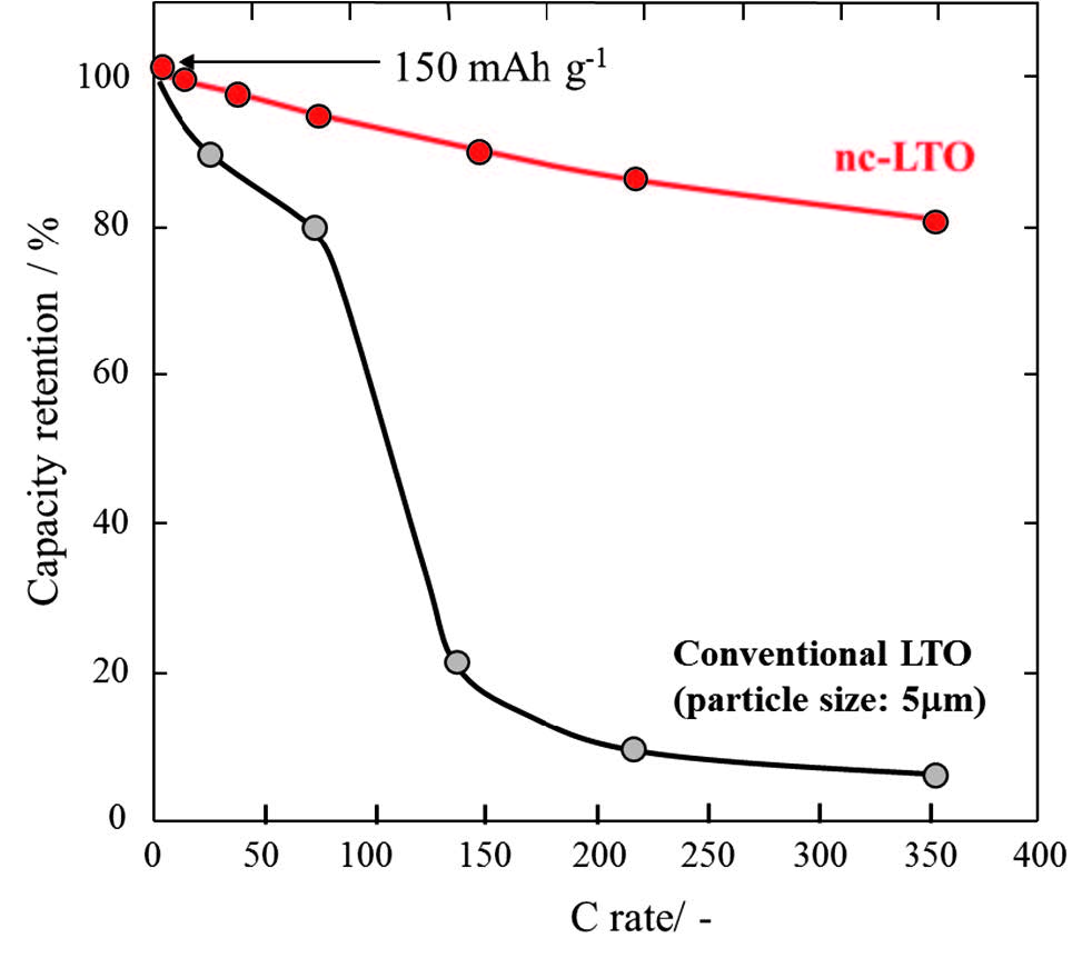 試作したNHCの各種試験を実施し,期待した特性を満たすことを確認している.図6-14に示すとおり,通常のLTOを用いたLICは高電流レートで容量が低下するが,nc-LTOを用いたNHCではその低下が大幅に改善されることが確認出来た.エネルギー密度はEDLCの4.2Wh/Lに対してNHCは13Wh/Lで約3倍が確保された.