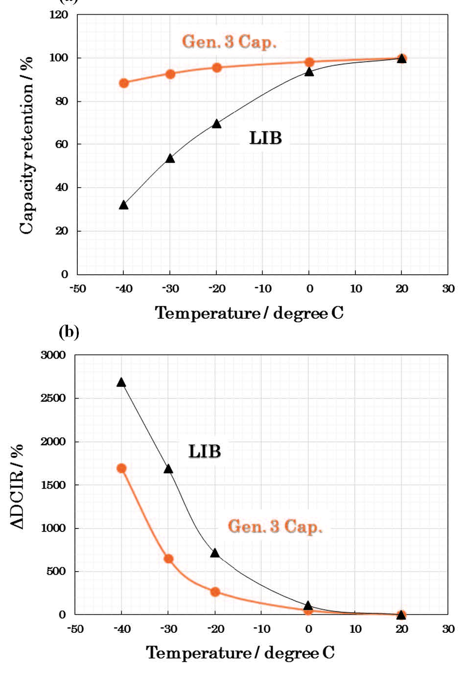 試作したGen. 3 CapとLIB,EDLCのラゴンプロット(出力密度とエネルギー密度の関係を示す図)を図6-15に示す.Gen. 3 CapはLIBと同様の70Wh/Lのエネルギー密度を確保しつつ,EDLCと同程度の高レートでの特性を確保出来ていることが分かる.低温時の特性は,図6-16に示すとおり,LIBよりも高い容量と低い内部抵抗値を示しており,LIBより有利であるが,50℃での充放電試験(図6-17)ではLIBと同程度の容量維持に留まっている.