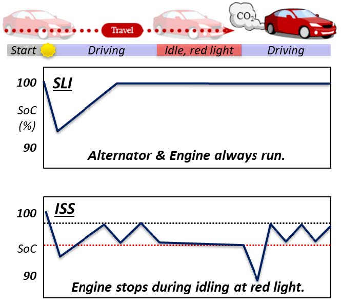 電動車両用ではないが,ICEVの省エネ対策の一つであるアイドルストップ機能の普及によって,鉛酸電池にも従来の電池とは異なる要求があり,これに対応するためにセパレータの工夫で対応し,良い結果が得られていることがMiyake(6-3)らから紹介された.従来の鉛電池はエンジン始動時の放電以降は常に充電状態にあり,やや過充電気味の状態で使用されてきた.そのため緩いガッシングによって電解液が循環し電解液の濃度が電解槽内で均一になっていた.これに対しアイドルストップシステム車(ISS)では図6-18に示す様に,頻繁なエンジン停止と再始動によって電池のSOCが低位にある状態となったため,ガッシングの機会がなくなり,電解液濃度の層状化(上部で濃度が低く,底部では濃くなる;図6-19参照)などによって電池性能の劣化・寿命の低下などの問題が発生し各種の対策が必要となっている.