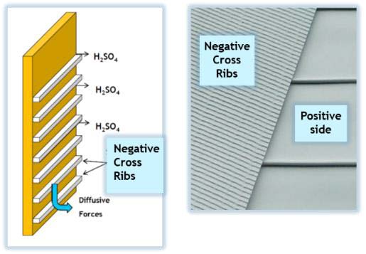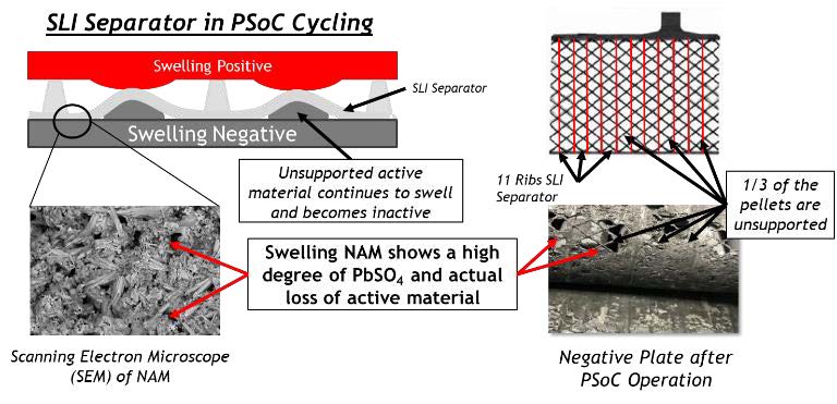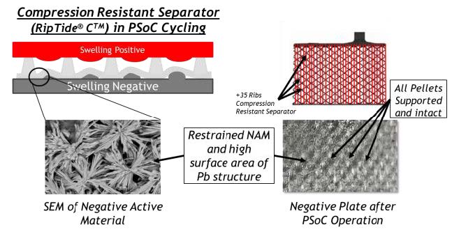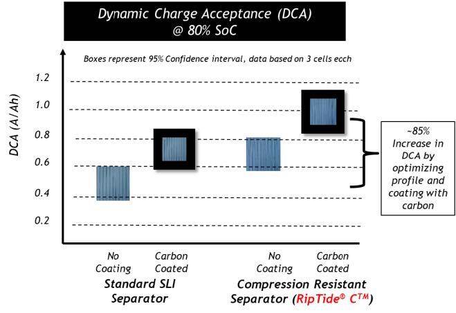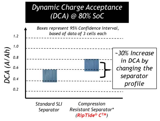 次に,ISS車では制動時の回生電力を効率よく受け入れる必要があるが,部分放電状態ではこの特性が低下することが知られており,この対策として市販電池では負極にカーボンを添加する方法が採用されている例もある.しかし,これによるデメリットとして水の減少とその結果としての寿命短縮が問題となっている.部分充放電動作で,一般のセパレータによる電池では負極が膨張し活物質の減少がみられる(図6-22参照)のに対し,提案する負極側に細孔を,正極側に多数のリブを設けたセパレータでは負極が均一に圧縮抵抗力を受けるので,この現象がみられず(図6-23参照),実際の試験で急速充電受け入れ性が30%改善したことが確認出来た(図6-24参照)としている.一方,カーボンが鉛結晶の増大化を阻止しているメカニズムを解析した結果,負極表面に接触するセパレータの表面をカーボンでコーティングすることで同様の結果が得られることを見いだし,試験によってこの考えの妥当性を確認している(図6-25参照).製造時の素材原価では5%以下しか占めないセパレータの工夫で,性能向上と寿命延伸を可能としたとしている.
