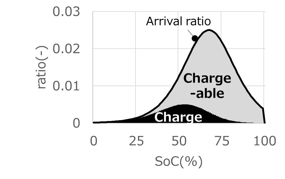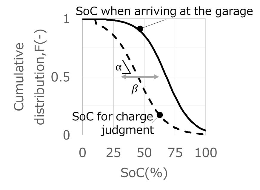 ここに,αは図6-26に示すとおり累積分布の傾き,βは累積値が50%になるSOCとなる.ただし,帰着時SOCが10%以下の場合は,必ず充電するとし,式(1)の値によらず,F=1とする.充電と充電可能状態の頻度分布は図6-27に示すとおりで,帰着EVの5台に1台が平均約10kWhの充電をしていること,デマンドに応じて充電可能な量は1台あたり4.7kWh程度であることがわかる.