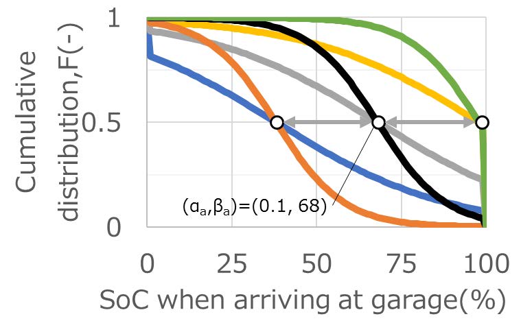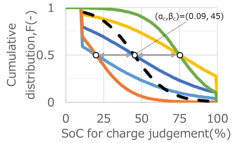 小田(6-4)らは,太陽光発電等の再生可能エネルギーの出力が増大した際に電力系統からのデマンドにEV充電が応じることを想定し,EV充電で対応可能な電力量を求める試みについて紹介した.自宅などでのいわゆる基礎充電場所に到着したEVのSOC(帰着時SOC)分布とEVユーザがSOCを参照して判断する充電の要否の関係を,EV利用者を対象に実施したアンケートから求めた.搭載電池の平均容量は20kWhで,出発時のSOCは平均80%(標準偏差:22.5),帰着時SOCは平均53%(標準偏差:21.4)で,全体の39%が充電の要否を帰宅時SOCで判断していた(36%は毎回充電.要否判断のSOCは数値で回答).この状態を基準ケースと呼ぶ. この充電判断基準SOCと帰着時SOCが正規分布を成すと仮定すると,累積頻度分布Fは式(1)で表される.
