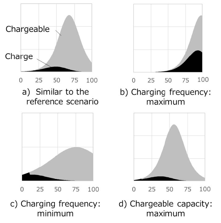 将来,搭載電池容量が増加した場合(例えば40kWh),EVでの選択幅が広がることから,α,βの値として表1の最左列の組み合わせを追加し,2種のα値,3種のβ値を組み合わせた6シナリオの累積分布(図6-28,図6-29参照)について,帰着時に充電する頻度と充電可能ではあるが充電しない頻度,充電電力,充電可能電力を求めている.だだし,搭載電池容量が増加してもEVの走行需要に変化はないと仮定した.このため,搭載容量の違いによる帰着時SOCや充電判断基準SOCの整合性をとることを試みており,これによる4種によって計24シナリオが存在するが,充電電力量の大きさに矛盾が生じるケースなどを除外して,19シナリオについて検討し,図6-30に示す特徴的な4シナリオについて解説している.a) は基準ケースに準じたもの,b) は充電頻度が高くなるシナリオ,c) は逆に充電頻度が最小のシナリオ,d) は充電可能の電力が最大になるシナリオである.