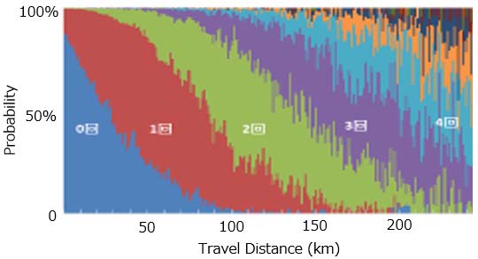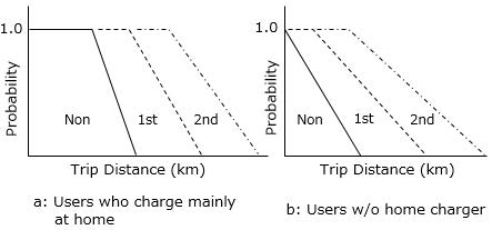 普通充電器を使用しない③は,普通充電器の設置のない集合住宅等に居住するユーザと推測出来る.②は公共急速充電器の定額使い放題などに加入しているユーザと推測でき,特異な条件であるので,①と③のみに着目して解析している.旅行距離毎の急速充電の占める回数は,図6-32(①に対応),図6-33(③に対応)の様に,普通充電器の有無によって明らかな差がみられるので,両者を,図6-34のようにモデル化している(詳細は省略).
