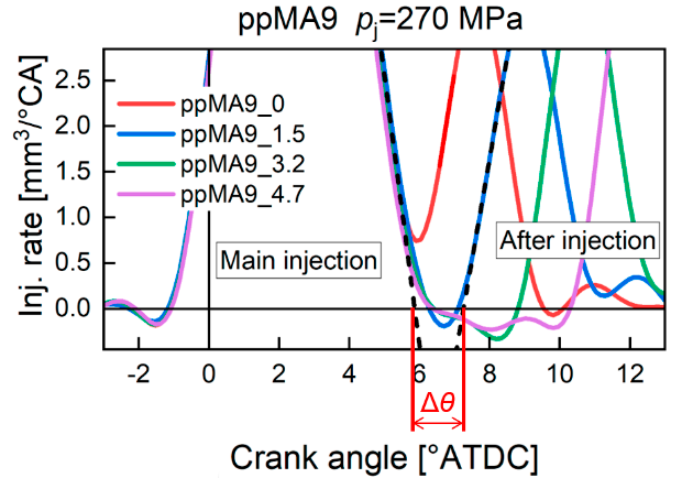 岸上(1-1)らは,「近接アフター噴射が小型ディーゼル機関の性能・排気に及ぼす影響」と題し,メイン噴射とアフター噴射の間隔,さらにはアフター噴射量,吸気圧力,噴射圧力が機関性能および排気に及ぼす影響を調べた.図1-1にメイン噴射に対する噴射間隔の定義を,図1-2に噴射間隔に対する機関性能と排気特性を示す.図から,アフター噴射なしの条件(ppM)と比較すると,アフター噴射ありの条件では冷却損失が減少し,熱効率が向上することがわかる.ただし,冷却損失低減効果は噴射間隔1-2°CA程度で最大となり,その後は増加に転じている.論文では吸気圧力,噴射圧力を変化させた条件についても体系的に調べており,吸気圧力が高い条件を除き,アフター噴射は等容度の大きな低下を防ぎつつ冷却損失を低減し,熱効率を向上するのに効果的であると述べている.また,発表では筒内可視化画像も示されており,今後,さらなる観察やCFDを併用し,現象理解が進むことと期待される.(橋本)