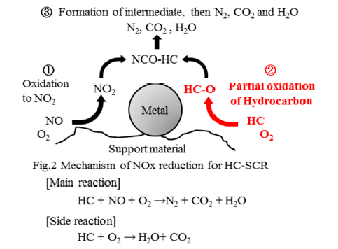 HC-SCRの主反応はNOの酸化反応と炭化水素の部分酸化反応(含酸素炭化水素の生成)が進み,NOxを還元するものである.HC-SCRにおいては,炭化水素の酸化によりCO2と水を生成する副反応を抑制することが性能向上のカギである.