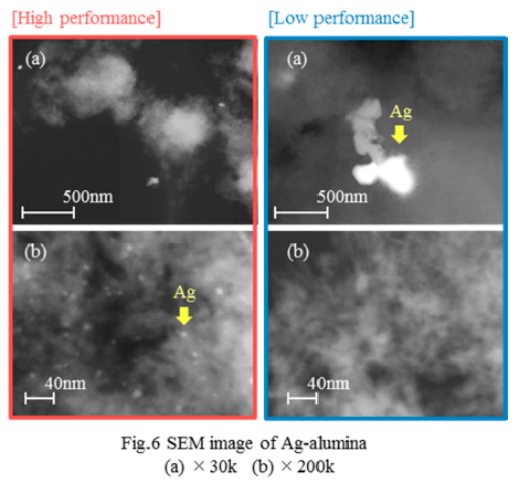 HC-SCR触媒として単体試験により,活性金属としてAg(銀)を使用したAg-アルミナ触媒を選定した.銀アルミナ触媒のNOx低減性能の高いものと低いものを比較するため,電子顕微鏡で観察を行った.図1-2に電子顕微鏡写真を示す.
