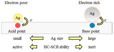 NOx低減において低性能触媒に対し高性能触媒はAg粒子が微細であることを示した.更にアルミナの酸強度を高めることによりNOx低減性能が高まることから,Agから電子が固体酸性の高いアルミナ担体に移動することで銀粒子がアイオニックの状態であると推定した.推定された触媒材料のコンセプトを図1-3に示す.これらの知見をもとに触媒を改良し,エンジン実機でNOx低減性能を評価した結果,改善を確認した.