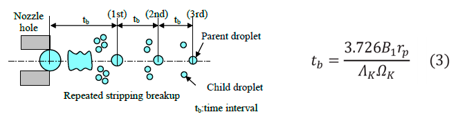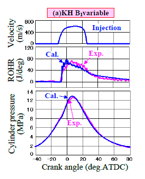 燃焼解析コードはKIVAで,早稲田大学で構築したコードをベースとし独自改良して使用している.従来のKH-RT分裂モデルでは実測の熱発生率波形を一部再現しない課題に対し,今回,KH分裂モデルをベースとして分裂時間算出のモデル定数B1(図2-1,式1)を適切に調整する方法を提案した.