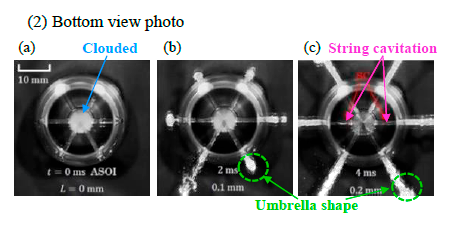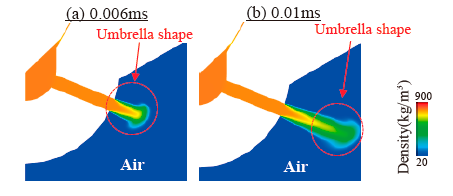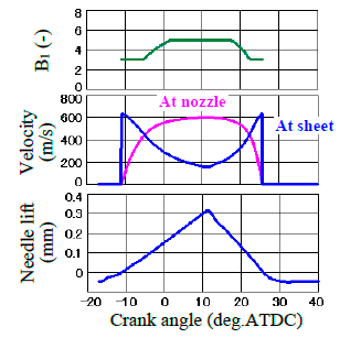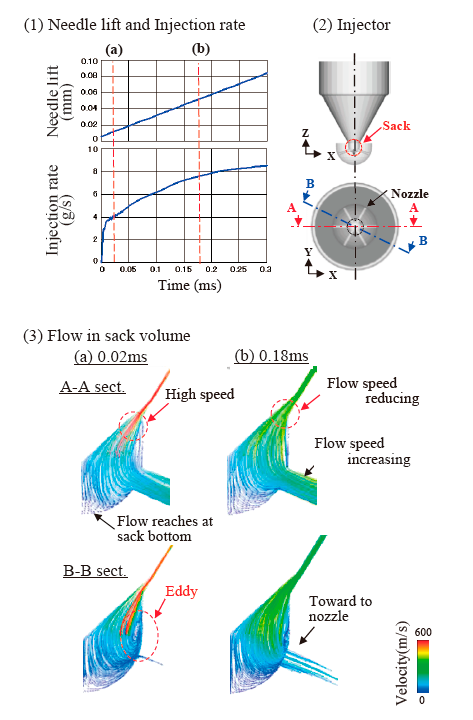 また,CFD流動解析および可視化拡大模型による噴射弁内の内部流動観察を実施し,低針弁リフト条件ではサック内の強い流動により噴射が不安定となり微粒化が促進される事象,また,初期に噴射された遅い速度の燃料が後からくる速度の速い噴霧に押し広げられる事象を捉え,モデル改良の妥当性を確認している(図2-4,2-5,2-6).今後,B1の定式化および他エンジンへの適用性の検討に期待する.(山田)