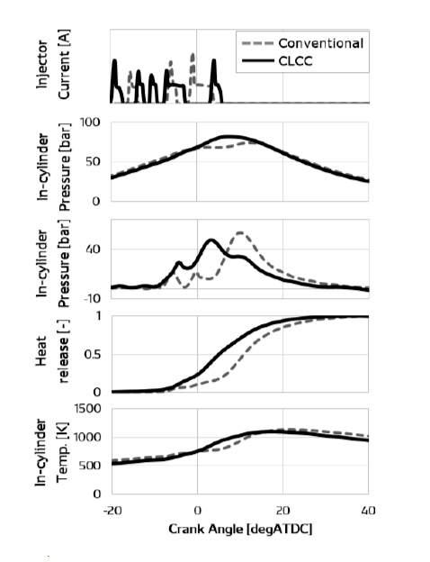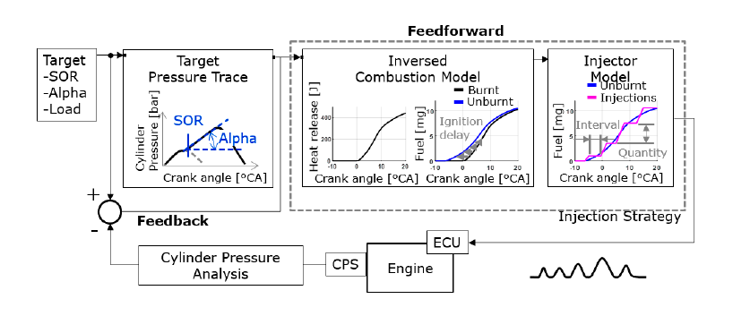 モデルベース適合において,まず各運転点にて目標排ガスを達成するための運転条件を机上算出し,この筒内圧履歴から2つの燃焼指標(SOR,Alpha)を定義して,目標値を設定している.これを満足する熱発生率,噴射率,噴射パターンを順にモデルで逆解析して噴射条件を自動算出し,指標の目標値によるフィードフォワード制御と,エンジン試験の指標値のフィードバック制御を行うCLCC(Closed-loop Combustion Control)制御アプローチを提案した(図2-8).