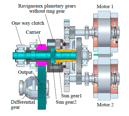 現在量産されている駆動用モータは,需要の多い小容量のものが中心となっており,大出力モータの開発は量産効果が劣る点がネックとなり,生産例が少ない.中沢ら(4-1)は,実績とコスト効果のある小型モータ2台を図4-1に示すラビニヲタイプの遊星歯車で結合した大型乗用EV用の低コストで大出力のモータシステムを提案した.