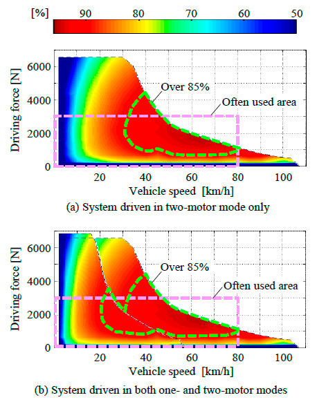 動作モードは,図4-3に示すように1モータモード,2モータモードのほかに二つのモードがある.その一つであるアクセル・ヒル・ストップ(傾斜地でのアクセルペダルでの停車または極低速走行)モードは,一般には大電流駆動となってインバータやモータ巻線の熱負荷に課題が多い難題であるが,ここではモータ1を逆転して両モータの速度を維持した状態で出力軸の極低速度やゼロ速度を実現することで,この難題を解決している点は注目に値する.既存のHEV用小型モータを用いたベンチ試験で,これらの基本的な特性を確認している.(清水)