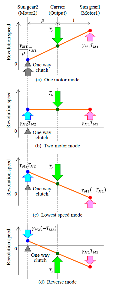 サンギア1とサンギア2(ワンウェイクラッチ付き)に入力された2モータの出力がキャリアから出力されるもので,図4-2に示す様に,小負荷域で1モータ動作,大負荷域で2モータの和動作をすることで,低負荷域での効率改善を可能にする.