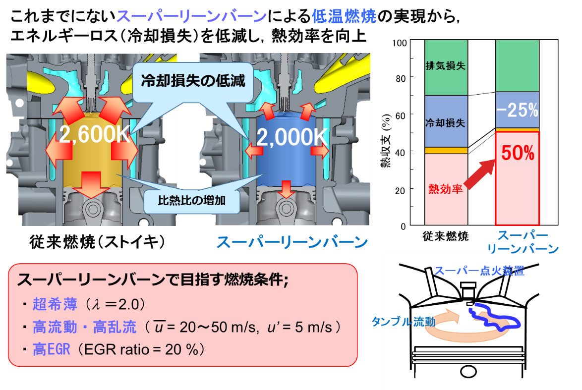 従来、乗用車用ガソリンエンジンは、理論空燃比(酸化剤である空気中の酸素と燃料であるガソリンとが過不足無く反応する混合比)にて燃焼させてきた。この燃焼は燃焼期間が短い一方、燃焼温度が2600Kと高い。そのため、燃焼ガスの熱エネルギーが燃焼室壁面から逃げることで生じる冷却損失は、熱収支の25-30%をも占める。そこでSIP燃焼のガソリン燃焼チームでは、理論空燃比に対して燃料濃度が半分程度の「超希薄燃焼」の実現を目指すこととした。これにより燃焼を2000Kの低温にし、熱損失を大幅低減させるというものである。(図2-1)