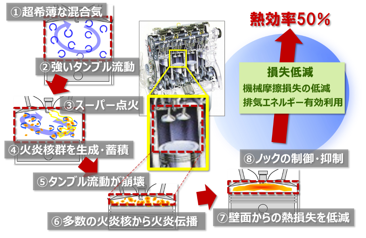今回の世界最高峰の熱効率値は、インサイドアウトなアプローチ、すなわち従来のエンジン開発の延長線上であるミニマムローカルから脱して、超希薄燃焼の原理をサイエンスから解析・解明し、その知見に基づきエンジン実験による燃焼技術を探求したことに依る。このことは、長い歴史を持つ本分野の研究に対する新たなアプローチの存在と、それがもたらすポテンシャルを明確に示した。