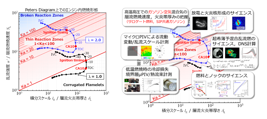 前項の研究構想を実現するためには、内燃機関工学や乱流燃焼科学に跨がる多様な研究者が深く連携しなくてはならない。そのための工夫として、エンジンの設計要件・運転条件と、乱流燃焼の物理量が結びつくよう、エンジン燃焼の構想を「Peters Diagram(乱流燃焼状態図)」に表し(2-1)、あらゆる分野の研究者が共通基盤に立って議論できるようにした(2-2)(図2-5)。