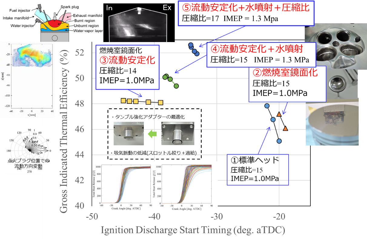 併せて、層流と乱流の燃焼速度、火炎帯厚み、乱流の強度とスケール、放電挙動、低温燃焼ガスと壁面間の境界層構造と冷却損失の関係、燃料とノッキング発生の関係など、エンジン現象の系統的な計測、機構解明を行うと共に、モデル化を行ったことも、世界で例のない取組である。こうして得た研究成果の一部を、以下に記載する。