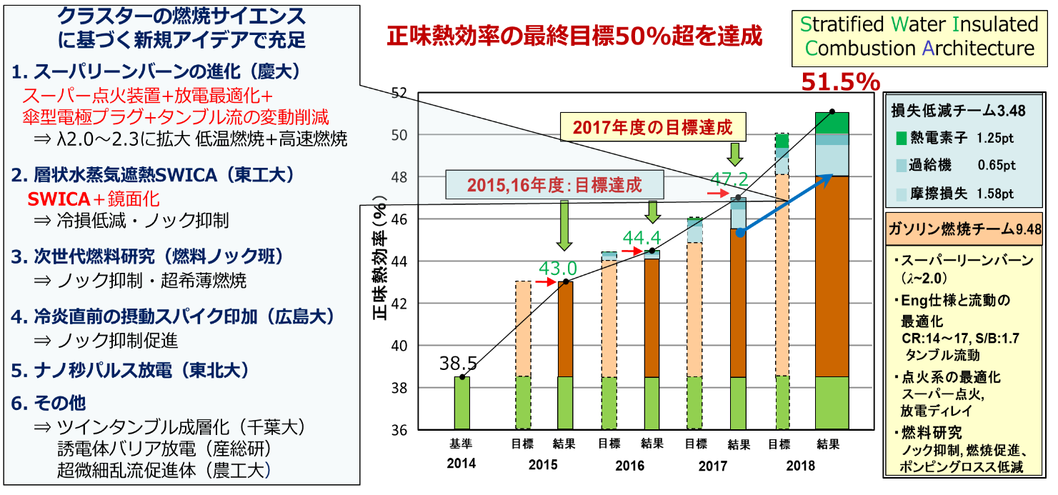 内閣府の戦略的イノベーション創造プログラムSIP「革新的燃焼技術」は、「乗用車用内燃機関の正味最高熱効率50%を達成」および「持続的な産産学学連携体制の構築」という2つの目標を設定した。約80大学が結集して4チームを構成。専門分野は、機械工学、内機関工学、燃焼科学、伝熱科学、反応化学、流体力学、トライボロジー、高分子化学、計算科学など多岐に渡る。