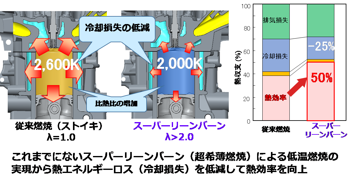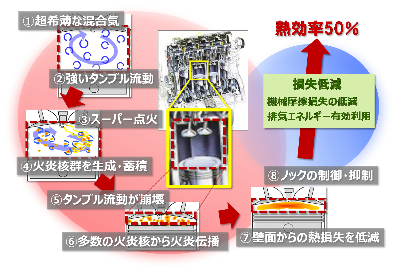 従来のガソリンエンジンでは、燃料と空気の比率を理論空燃比で燃焼させることが殆どであるが、この燃焼では燃焼ガスが高温となり、燃焼室壁面を介して熱収支で約30%の熱エネルギーが逃げることとなる(冷却損失)。そこで、これまでにないほど希薄な混合気条件(空気過剰率λ > 2.0)で燃焼させて燃焼ガスの温度を可能な限り低くし、冷却損失を大幅に低減させることで相対的に熱効率を向上させることがスーパーリーンバーン(超希薄燃焼)のコンセプトである(図3-1)。しかし従来、超希薄な混合気条件下では着火性や火炎伝播性が低下しサイクル毎の燃焼も不安定となることから、エンジンとして安定に作動させることが基本的には困難であった。そこで当プロジェクトではスーパーリーンバーン実現のために、図3-2のようなエンジン内の高度な燃焼制御技術、すなわち超希薄な混合気に対し、②燃焼室内に強いタンブル流動を形成、③火炎核を安定して形成できる強力・最適点火、④→⑥火炎核の多点形成と安定した火炎伝播による燃焼期間の短縮、⑦低温燃焼による燃焼室壁面からの冷損失低減、⑧ノッキング発生の抑制・制御による燃焼時期の最適化を念頭に各研究を進めた。以下には、その一部を紹介する。