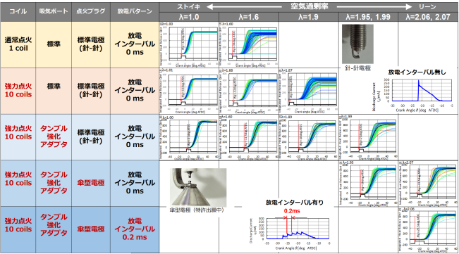 スーパーリーンバーンでは、従来通りの点火では十分な火炎核の形成を行うことができず、安定した混合気の着火や火炎伝播を実現させることは難しい。そこで当プロジェクトでは、複数の点火コイルを連結させた強力点火システム(図3-3)を構築し、点火のための放電エネルギーを強化した(3-3、3-4)。図3-4は、SIPで試作されたエンジンに対し、強力点火システムや、その他幾つかの要素技術を組み込んだ試験によるリーン限界の拡大の様子を示している。図中の線図はサイクル毎の総発熱量のクランク角履歴を複数重ねて表示したものである。強力点火とした場合には、通常点火に比べてリーンな状態でも総発熱量のバラつきが小さい、すなわち安定した燃焼が維持できている様子が分かる。また、タンブル流の強化や電極形状の工夫、複数コイルの時間差放電による放電パターンの調整などで、さらにリーン限界を拡大することも可能であることが分かる。図3-5は今回使用したエンジンと強力点火システムで観察された放電の様子である。放電は開始後から右方向に伸長し、ある時期で吹き消えると共に再びプラグ電極間で放電(再放電)を開始することを繰り返している。これらの現象は、プラグ位置でのガス流動、放電パターン、プラグ形状等が密接にかかわるものであり、また、如何に適切な放電状態を利用できるかが着火やその後の燃焼状態に強く影響する。