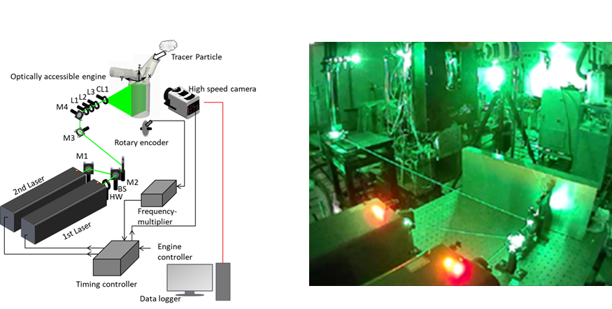 上述の通り、プラグ位置でのガス流動は着火性やその後の燃焼に強く影響するため、その流動状態について詳細に計測・検討を行った例を示す。図3-6は流動の可視化に用いたレーザ計測システム(高速PIVシステム)であり、クランク角度1deg以下の時間間隔でも連続速度分布計測が可能となっている。計測された瞬時速度分布の様子を図3-7に示す。吸気行程中に強い気流の流入が起こり、それによって縦方向反時計回りの回転流(タンブル流)が生じていることが分かる。このタンブル流は圧縮行程から点火までの間にも存在し、その挙動はサイクル毎で異なり(サイクル間変動)、さらにその変動要因についても解明が進んでいる(3-5、3-6)。このような流動変動は先述の放電挙動とも密接に関係があることは自明であり、流動の特徴・現象を理解した上で、如何に適切に利用・制御できるかが、安定した着火や燃焼を実現するための一つの鍵になる。