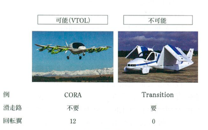 一つ目の切り口は、垂直離着陸が可能かどうかである(図3-1)。一般的に、垂直離着陸が可能な航空機をブイトール(Vertical Take-Off Landing:VTOL)と呼んでおり、代表例に、アルファベット(Alphabet)社のラリー・ペイジ氏が出資している、米キティホーク(Kitty Hawk)社の機体、コーラ(CORA)がある。多個のロータ(回転翼)を使って垂直に離着陸し、飛行時は固定翼とプッシャーと呼ばれるプロペラ(機体後部にある推進用回転翼)で飛行する。一方、垂直離着陸型でない機体の例としては、米テラフジア(Transition)社のトランジション(Transition)がある。こちらは通常の飛行機のように、垂直離着陸はせず、滑走路を必要とする。