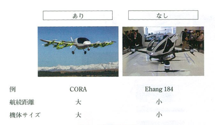 二つ目の切り口は、固定翼の有無である(図3-2)。前述のコーラ(CORA)は固定翼を有し、飛行機のように滑空可能である。燃費面で有利であり、比較的長い航続距離(〜100km程度)が必要な用途に適している。ただし、固定翼を備える分だけ機体サイズが大きくなり、離着陸の場所には制約がかかる。一方、中国のイーハン(Ehang)社のイーハン184(Ehang 184)のような固定翼のない機体は、俗にマルチコプタータイプと呼ばれ、常にロータを回し続けることになるために燃費が悪く、航続距離は短くなる。ただし、機体サイズが小さくて済むため、より多くの場所での離着陸が可能であるという特徴がある。