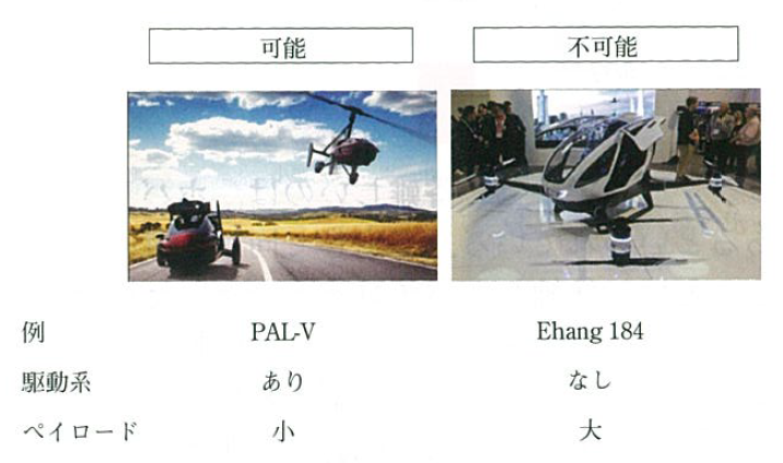 三つ目の切り口は、地上走行の可否である(図3-3)。蘭パルヴイ・インターナショナル(PAL-V International)社のパルヴイ・リバティ(PAL-V Liberty)は、飛行に加え地上走行が可能であるが、走行ユニットが搭載される分だけ、ペイロード(搭載可能重量)が減ることになる。一方で、イーハンのような走行ユニットがないものは、地上走行が出来ずに、地上移動は他のモビリティを乗り換える必要があるというデメリットがある。ただしペイロードが大きくなり、一度により多くの人・物を運べるという利点がある。