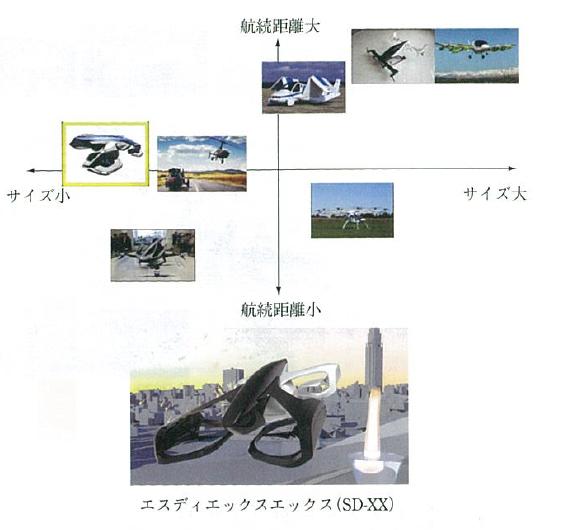 有志団体CARTIVATOR(カーティベーター)およびSkyDrive(スカイドライブ)社が共同開発する空飛ぶクルマ・SkyDrive(スカイドライブ)は、この三つの切り口で分類すると、垂直離着陸可能、固定翼なし、地上走行可能な機体となる。コンセプトモデルが、図3-4に示すSD-XX(エスディーエックスエックス)である。マルチコプタータイプによる世界最小クラスのコンパクトさを保ちながら、垂直離着陸機能と走行機能を備えることで、どこからでも飛び立て、さらに地上走行も合わせることで航続距離延伸を狙ったものである。目標である今夏のデモフライトに向けて、日々開発を行っている。