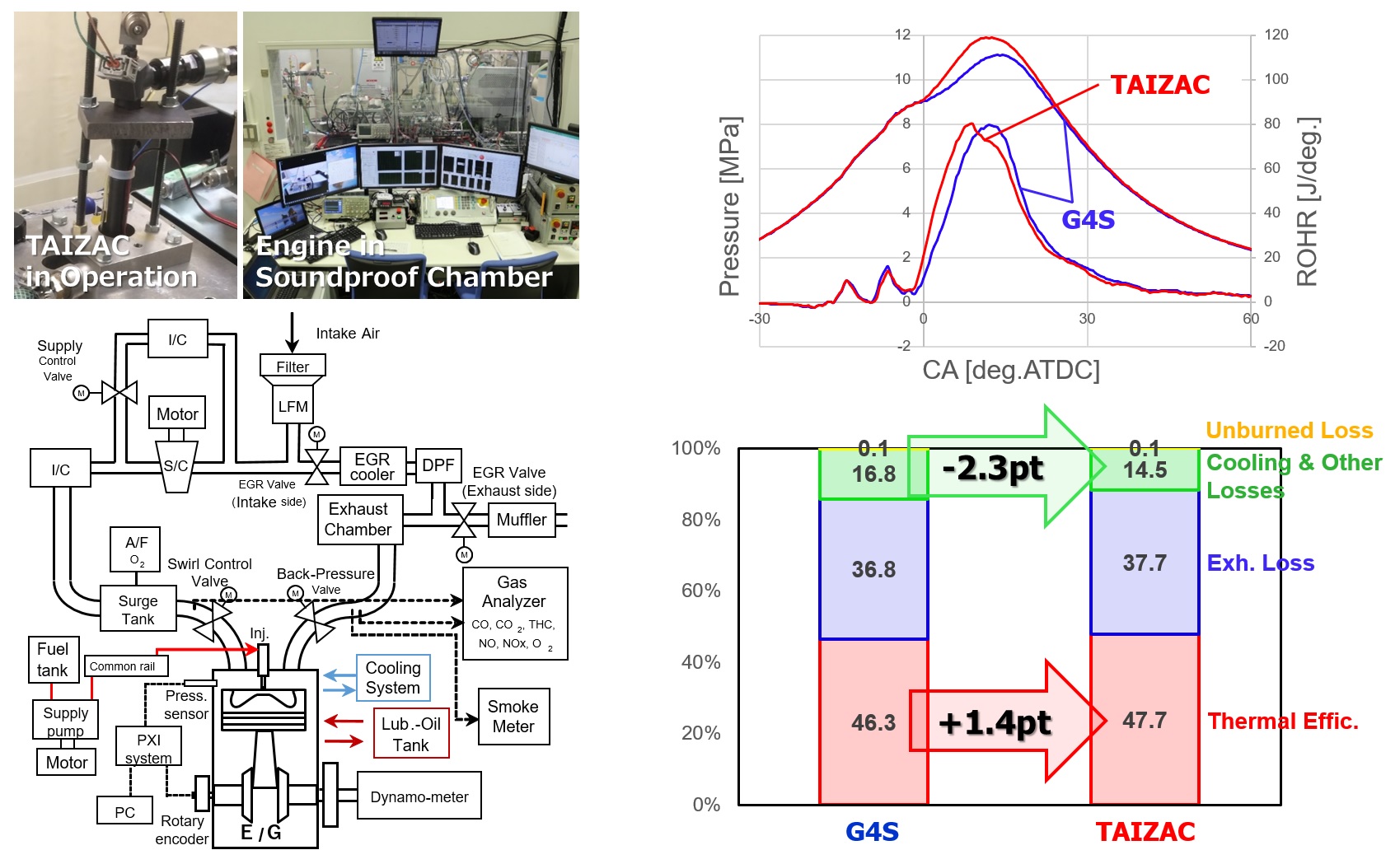 TAIZACを搭載した単気筒(2-3)および多気筒エンジンで性能試験を実施した。従来のG4Sソレノイドインジェクタに比べ、第2世代TAIZACで冷損2.3pt低減、図示効率1.4pt向上を実証した(2-3)。SIP終了後に実施したG4Pピエゾインジェクタとの比較でも、第4世代TAIZACで冷損0.7pt低減、図示効率0.4pt向上を実証している。SIP半ばの年度末2日間で2階にあった研究室のすべてを1階へ引越し、動力計400V専用線を敷設、学生30名が机を並べる研究室内に完全防音エンジンセルを設置、エンジンおよび動力計を導入し、0.1pt%精度の熱効率向上実証になんとか漕ぎ着けた。