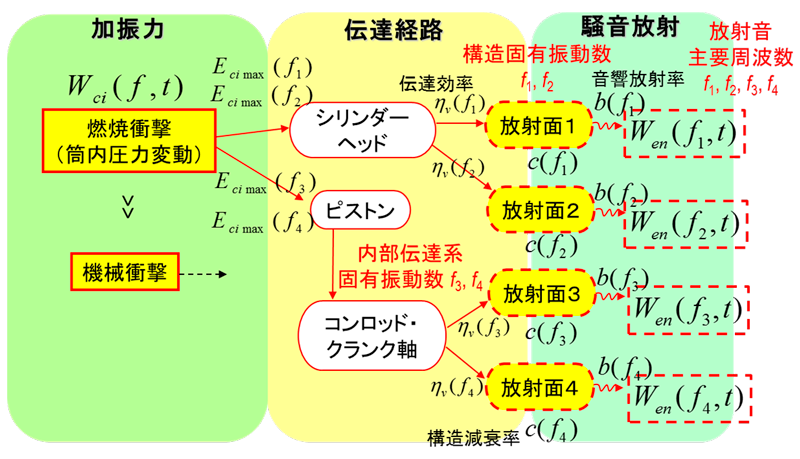 図5-1にエンジンにおける燃焼騒音発生の概念図を示す。燃焼室内の圧力変動による衝撃はシリンダヘッドやピストンに作用し、最終的にエンジン外表面振動となり、音として放射される。ピストンに作用した衝撃はコンロッド、クランク軸を経由して伝達する。筆者の研究グループでは、この騒音発生過程を、(1)燃焼衝撃パワーの伝達・振動エネルギーとしての蓄積、(2)振動エネルギーの構造内減衰、(3)エンジン外表面からの騒音放射、の三つの過程に分け、時間変化と周波数特性の両面から捉えたモデルを提案している(5-1)。騒音低減化を行う際には、これらの様々な過程の観点を考慮することで効果的な策が可能となるものと考えられる。
