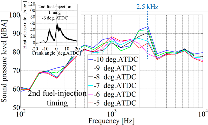 燃焼衝撃を抑制する手法として、27回の燃焼の圧力変動が逆位相となり打消し合うことで騒音低減を図る消音スパイク燃焼がある(5-2、5-3)図5-2に1段目の燃料噴射指示時期を-24 deg.ATDC、2段目を-6 deg.ATDCとした場合の熱発生率履歴を示す(5-4)。この場合1段目と2段目の圧力波が打ち消し合う周波数は、0.8kHz、2.5kHzである。図5-2に、2段目の噴射時期のみを変化させた場合の騒音レベルの周波数特性を示す(5-4)。燃料噴射指示時期が-6 deg.ATDCの場合に2.5kHzの騒音レベルが最も低いのは、この逆位相効果によるものである。ただし、同位相周波数では増幅されることに注意が必要である。