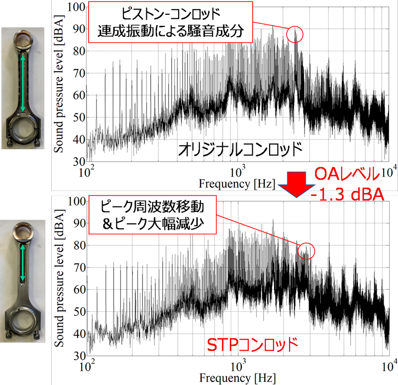 次に、構造面からの騒音抑制策を検討するうえで、燃焼衝撃の主要な伝達経路のピストン―コンロッド―クランク軸の内部伝達系に注目した。ピストンの運動方程式とコンロッド内の縦波の波動方程式を連成した簡易モデルにより連成振動数は約2.3kHzとなり、このエンジンで最も高い音圧レベルを示す2.5kHz成分に影響を与えていることが明らかとなった。そこで、コンロッド肉抜き部を短縮し縦波伝搬可能距離を短くすることで、振動数を高周波側へ移動させたSTPコンロッドを試作した。図5-3に示すとおり、コンロッドをSTP化することで、2.5kHz付近のピークは移動し、騒音のオーバーオール(OA)レベルも1.3dBA減となった(5-4)