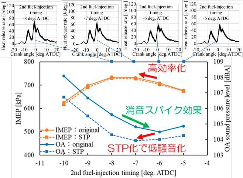 2段燃焼による消音スパイク効果が有効となる周波数を構造の固有振動数に一致させても、熱効率や排ガス成分の観点で有効とならない場合もある。図5-4に、図5-2と同様の2段燃焼時の2段目噴射指示時期に対する騒音オーバーオール(OA)レベルと図示平均有効圧力(IMEP)を2種類のコンロッドを用いた場合に対して示す(燃料噴射量一定条件)(5-4)。オリジナルコンロッドを用いた場合には、騒音レベルが最低となる条件と熱効率最大条件とは一致していない。これに対し、コンロッドをSTP化すると、構造の固有振動数が高周波数側に移動し、騒音低減効果が最大となる二段燃焼間隔を短縮できるため、熱効率も維持できている。