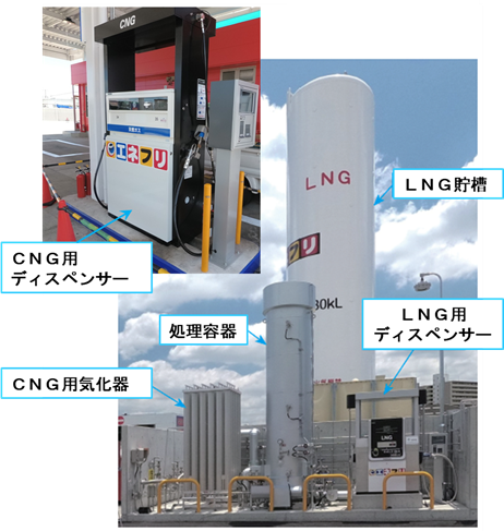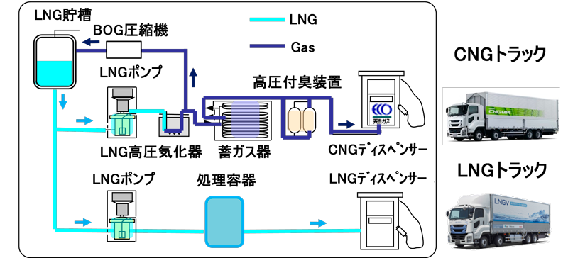 本事業で建設されたLNG燃料充填スタンドはLNG車だけでなく、LNG燃料を圧縮後に気化することでCNG車にも燃料充填が可能な燃料充填スタンドである。(図4-1)