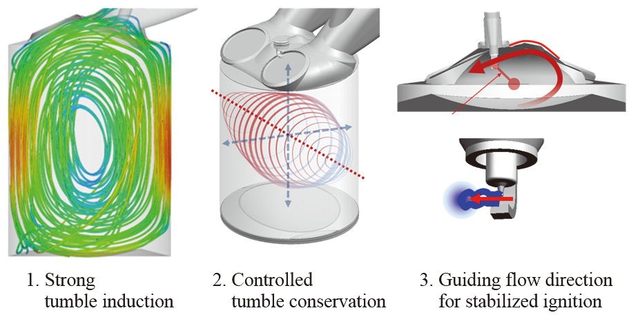 鈴木ら(1-2)は電動車用に発電専用としたエンジンに特化した希釈燃焼の熱効率向上に関する設計指針を提言した。エンドスコープによるプラグ近傍の可視化を行ったサイクル変動の発生要因結果に基づき、サイクル変動の少ない強いタンブル流れによる放電チャンネル安定化のためには、タンブル流れを上面に合わせ剥離なく導入する、タンブル流れを点火時期まで保持する、点火プラグに向かう流れの方向性を整えるという流動設計指針を提示した。設計指針の具現化には、コールドスプレーによるバルブシートレス技術を採用しており、EGR率30%まで安定した燃焼により正味熱効率43%を実現した。今後、流動が混合気形成や壁面への熱損失へ与えるの影響を含めた設計指針の提案が期待される。