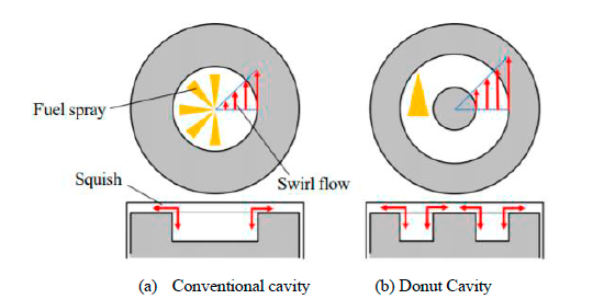 坂寄ら(4-1)は高速ディーゼル燃焼の新しいコンセプトを提案した。この燃焼では、ドーナツ型のピストンキャビティ内に強い旋回流を閉じ込めることで旋回流とスキッシュ流による強流動場を形成し、この旋回流に沿って単噴孔ノズルから燃料を噴射し高速燃焼させる(図4-1)。