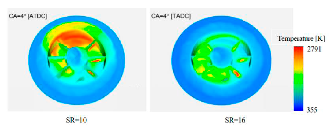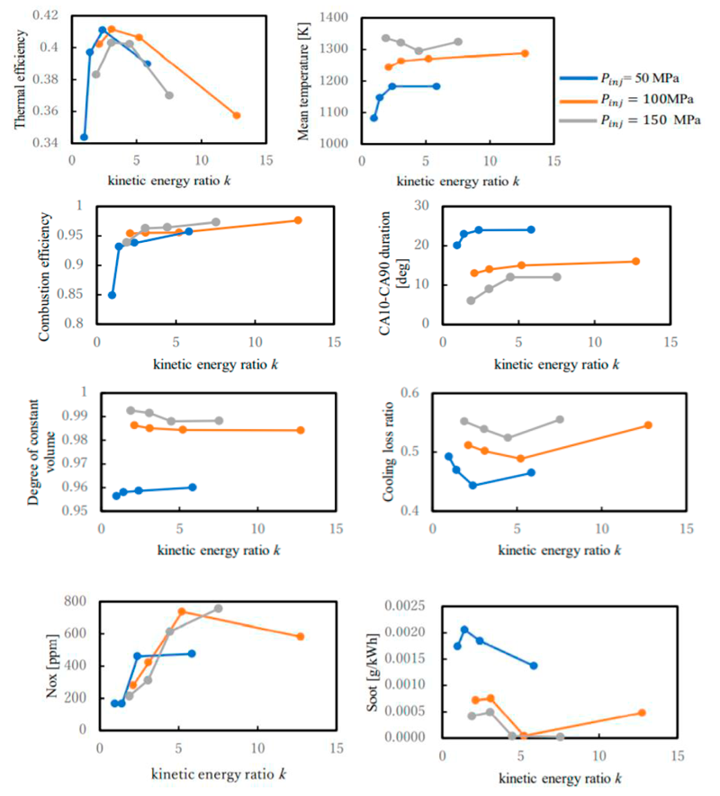 燃料噴霧が燃焼室壁面へ垂直に衝突することを避け、単噴孔ノズルによる噴射でありながら、急速旋回流に沿って燃焼室全域の空気利用を促進し燃焼を短期間に終了させるアイデアである。当該コンセプトに対し、3次元数値解析を行い、得られた結果を燃料噴霧の運動エネルギーの旋回流運動エネルギーにたいする比(k)により整理し、kが2~3程度で図示熱効率が最大となること(図4-2)、旋回流を強めると高温既燃気体が未燃燃料に重なることで後燃えを促進すること(図4-3)などを明らかにしている。数値解析結果のみの報告であるが、高速ディーゼル燃焼の新しい燃焼コンセプトとして期待される。