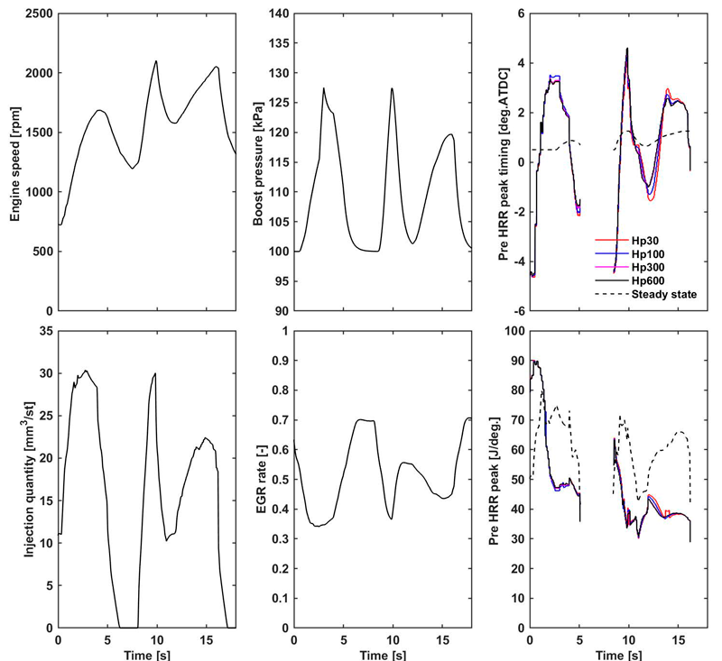 金ら(4-2)はPCCI燃焼の過渡制御を、ドライバ特性を考慮した燃焼制御目標値設定によりモデルベース制御する新たな手法を提案した。制御対象は燃料3段噴射のPCCI燃焼であり、パイロット噴射とプレ噴射により発生するプレ熱発生率のピーク値と、その発生時期が制御目標値となる。操作量はプレ噴射時期と噴射量である。既開発のフィードフォワード燃焼モデルに、ドライバのアクセル操作を単純な1次遅れモデルで表現したドライバモデル(エンジン回転数と燃料層噴射量を1次遅れで表現、図4-4)を組み合わせて、過渡運転時の制御目標値を補正している。提案手法の効果を、WLTC過渡運転を対象とした数値解析により調べている。 図4-5はその結果であり、右端の図において定常目標値設定が破線、ドライバの応答時間を変化させた場合の提案モデルによる目標値設定が実線で示されている。ドライバの応答時間が制御目標値に影響することが明らかである。PCCIのような過渡運転時のロバスト性が低い燃焼のポテンシャルを最大化するには、ドライバのモデル化が必要であることを示すものであり、今後のエンジン制御の方向として注目したい。