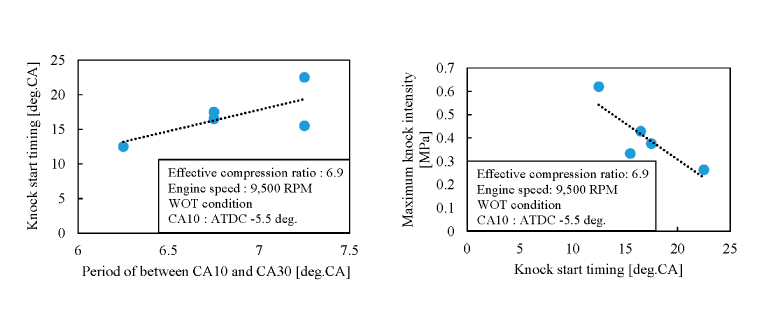 衞藤ら(5-1)は「チェンソー用2ストロークエンジンで発生する高速ノックの強度に影響を与える要因」と題して講演を行った。排気量59.8 cm3の2ストロークエンジンにおいて、回転速度9500 rpmという高速域でのノッキングの発生特性についての試験結果が報告されている。燃料には、異なるベンダーによる2種類の燃料を用いている。これらの燃料はいずれも北米排ガス認証用燃料であるため、オクタン価などの基本性状は同じである。それにもかかわらず、燃料の違いによって、同一運転条件でのノック発生時期やノック強度が異なることが示されている。図5-1に、初期火炎速度とノック強度の関係(左)、ノック時期とノック強度の関係を示す。初期火炎伝播速度が速いほうが、より強いノックが生じることが示されている。この理由として、火炎伝播速度が高い条件では着火遅れが短くなるためだと考察されている。このような高回転域でのノッキングの試験結果の報告例は少ないことから、貴重なデータだと考える。