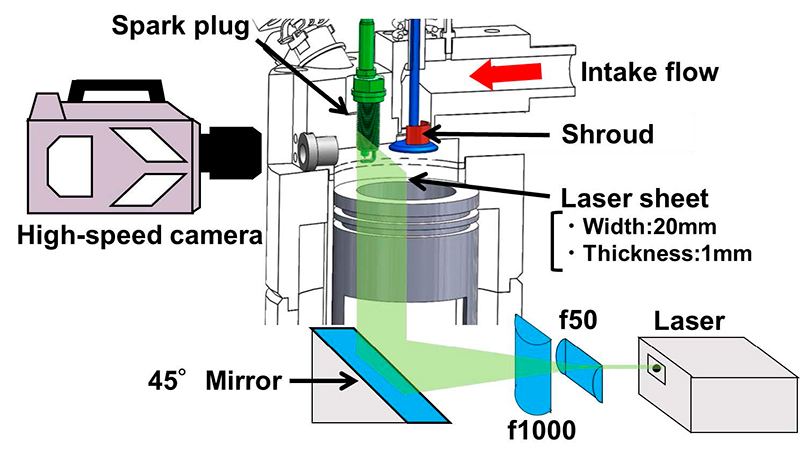 岡本ら(7-2)は、圧縮膨張機関を用いて点火プラグ近傍における流動場のPIV計測と火花放電挙動の可視化を行った。PIV計測時の試験装置の構成を図7-5に示す。