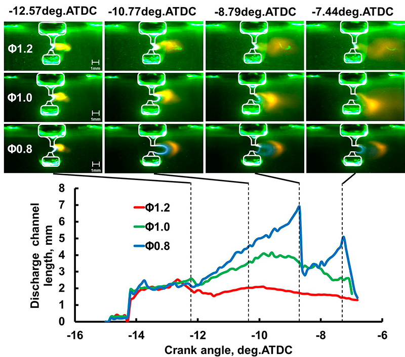 当量比をφ1.2、1.0、0.8と変化させた場合の可視化画像および放電チャネル長さを図7-6に示す。図7-6の可視化画像から白色の放電チャネルと輝炎が観察される。φ1.2のリッチ側条件では放電チャネル長さがほぼ一定で初期火炎核の位置が安定しているが、φ=0.8のリーン条件では放電チャネル長さが流動によって伸ばされ、-8.79deg.ATDCでは短絡して再放電が生じていることが分かる。