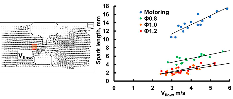 また図7-7に示す通り、流速が大きくなるにしたがって、放電チャネル長さは大きくなっていることが分かる。本研究は流動場と放電を同時に計測し、鮮明な可視化画像が得られており、火花放電現象の理解に参考となる。