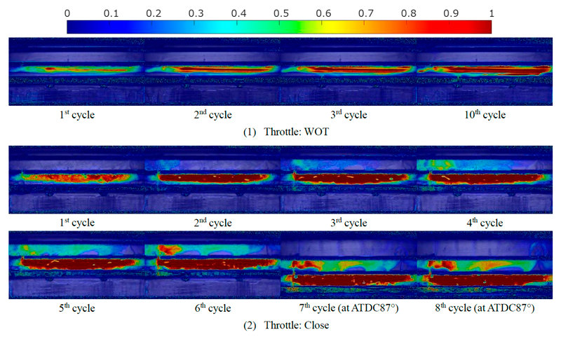 図8-2は吸気行程のATDC80°でレーザを長楕円状にしてサードランドに照射して油膜の観察をした結果で、ランド上の厚い油膜が確認でき、この油膜は図8-2 (1)のWOT条件では10サイクル後も油膜の移動がないが、図8-2 (2)のClose条件では6サイクル目で油膜はトップリングの合口下部に到達し、8サイクル目ではトップリング溝からトップランドへ輸送される現象が観測されている。LIF法では油膜流れの速さや方向の詳細は不明な場合が多いが、この方法では時々刻々の油膜の輸送の様子が明確に分かり、LOCのメカニズム解明や解析モデル構築に期待が寄せられている。