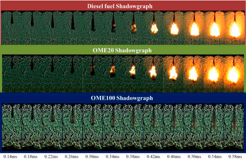 佐々木ら(9-1)は将来e-fuelの一つとして期待されているポリオキシメチレンジメチルエーテル(OME)と軽油の混合燃料について、噴霧特性と燃焼特性を定容容器試験機により実験的に調べた結果について報告した。表9-1にOMEと軽油の混合燃料の主な物性値を示す。定容容器を用いて、混合燃料の非燃焼蒸発噴霧と噴霧燃焼の高速度撮影を行い、噴霧特性等を計測している。図9-1は軽油とOME混合軽油の高速度撮影画像である。得られた結果から、OMEおよびOME混合軽油は軽油に比べ噴霧内平均当量比が希薄化することを明らかにしている。e-fuelなど将来の燃料多様化に対するエンジン技術開発のために有用な基礎データを取得している。