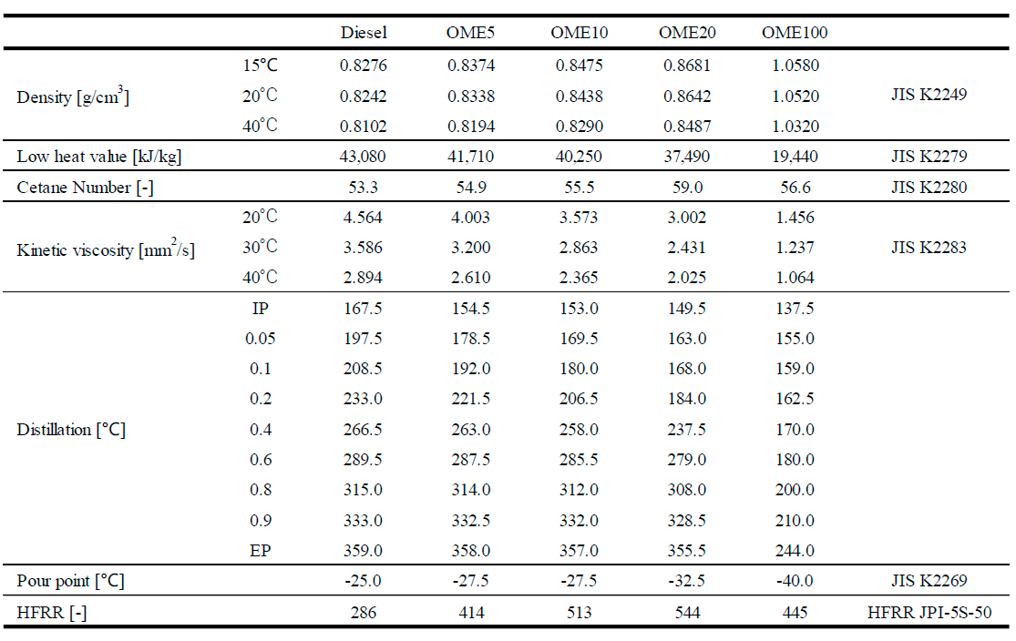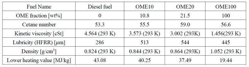 森田ら(9-2)は将来e-fuelの一つとして期待されているポリオキシメチレンジメチルエーテル(OME)と軽油の混合燃料について、OME添加がゴム製エンジン部品に与える影響と、混合燃料を用いた場合の機関性能を調べた結果について報告した。表9-2に用いた試験燃料の主な物性値を示す。エンジン配管系のシール材に使用されるNBRとKFMの2種類のゴムシートのOME混合軽油への浸漬試験を行い、引張強度と体積膨張率の変化を計測している。