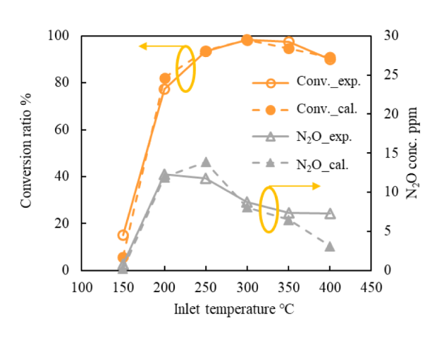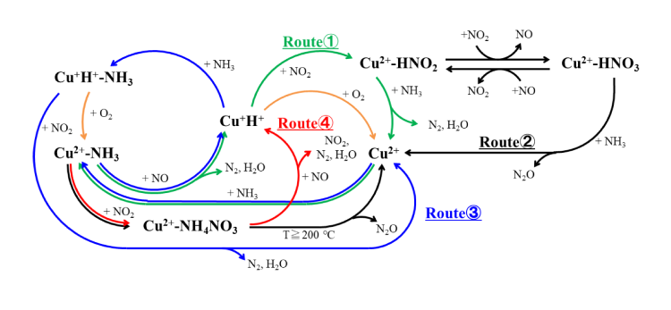 上山ら(10-1)はディーゼル機関のNOx浄化技術である、尿素水を用いた選択還元触媒(Selective Catalytic Reduction, SCR)上の反応として、NO2/NOx比が0.5のFast SCR反応モデル構築に関する研究を報告した。まず、Cu-chabazite触媒のFast SCR定常条件下において、150~550℃の範囲でTPDによりNO、NO2成分の浄化率を確認したところ、NOとNO2の反応量比は1:1となるはずだが、実際にはNO2の方が多く消費されていることが判明した。そこで、NO2存在下で実検証に基づいて反応経路を検討し、図10-1に示す四つの反応経路、①、②:NO2吸着によって形成された亜硝酸塩、硝酸塩を起点とする経路、③:吸着NH3を経由した経路、④:硝酸アンモニウム(NH4NO3)の生成を経由する経路をまとめた。さらに、これらの反応経路の影響が温度とともに変化することを示し、低温(約200℃)ではすべての反応経路がNOx浄化に関与し、高温(300℃以上)ではNH3の表面被覆率の低下により①から始まる反応経路が支配的と推測した。以上の条件を元にFast SCR反応モデルを構築し、150〜400°Cの温度範囲でのNOx浄化率とN2O生成の挙動を正確に説明できる反応モデルを提示した(図10-2)。